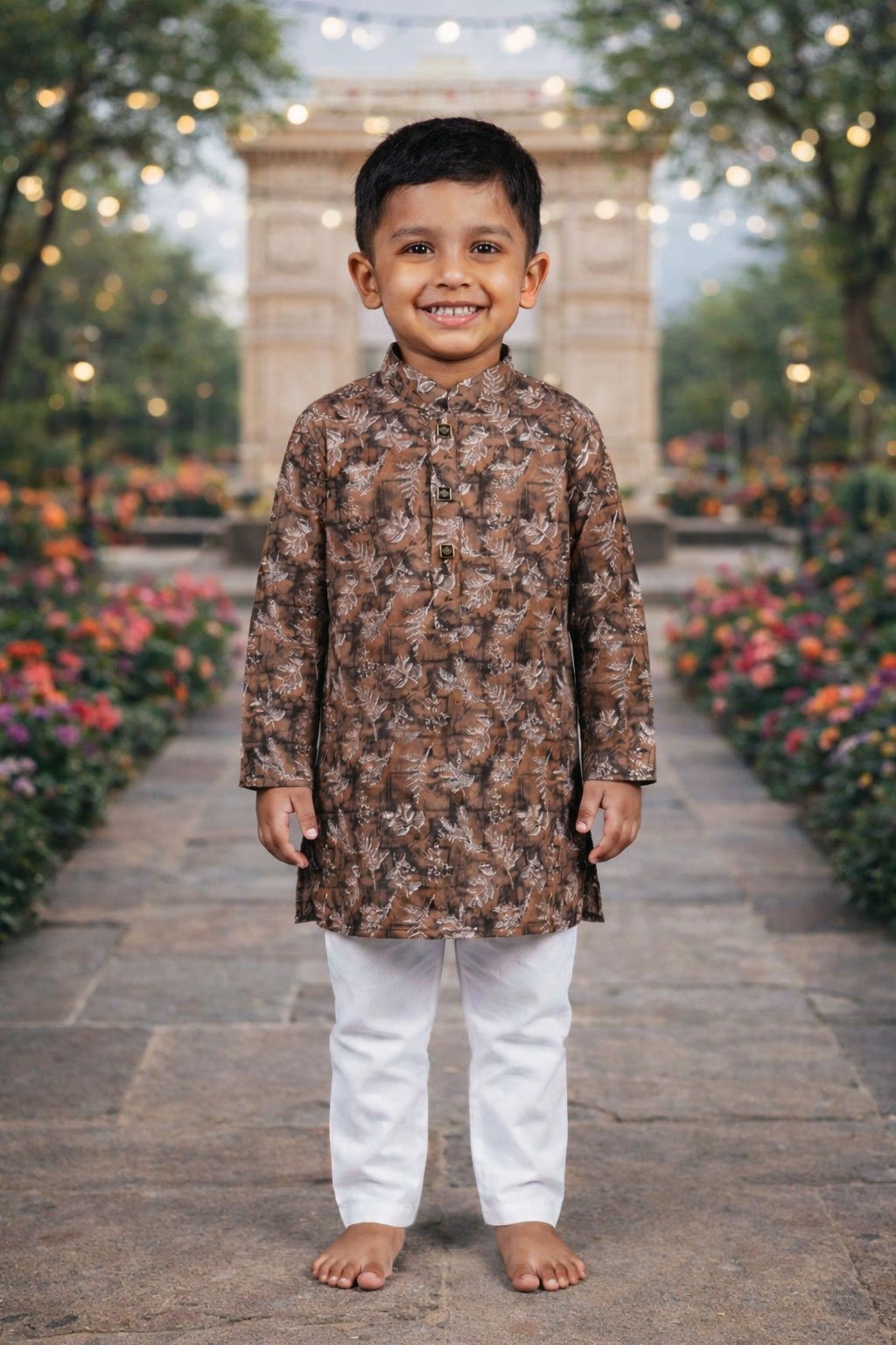 Break Or Die | Hand & Heart™ Kids Brown Floral Printed Kurta Set with White Pajama | 4T