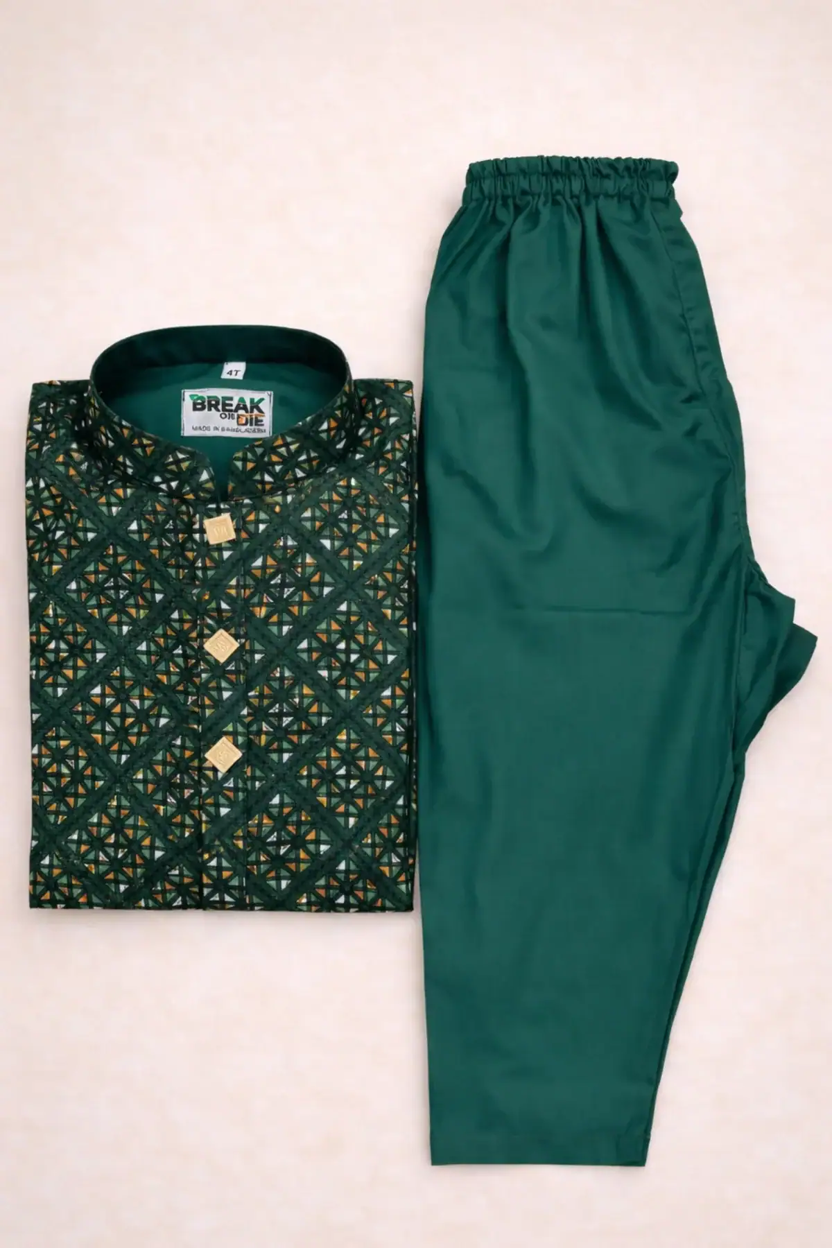 The Break Or Die | Hand & Heart™ Kids Emerald Green Geometric Printed Panjabi Set with Emerald Green Pajama is designed to celebrate tradition with softness, comfort, and timeless elegance—made especially for your little one’s precious moments.