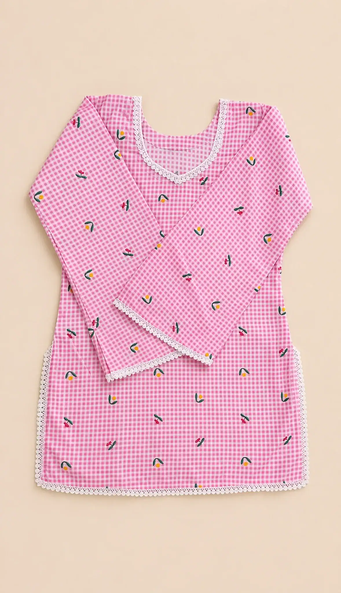 Classic small-check pattern in a fresh pink tone for a youthful and elegant look. - Delicate Embroidered Motifs