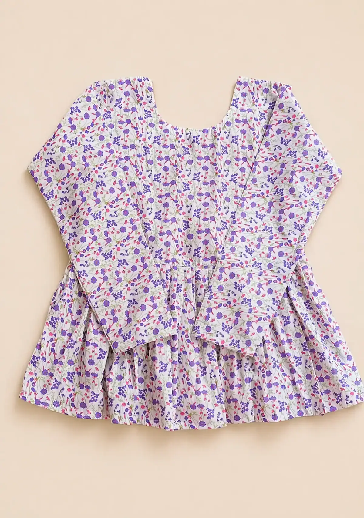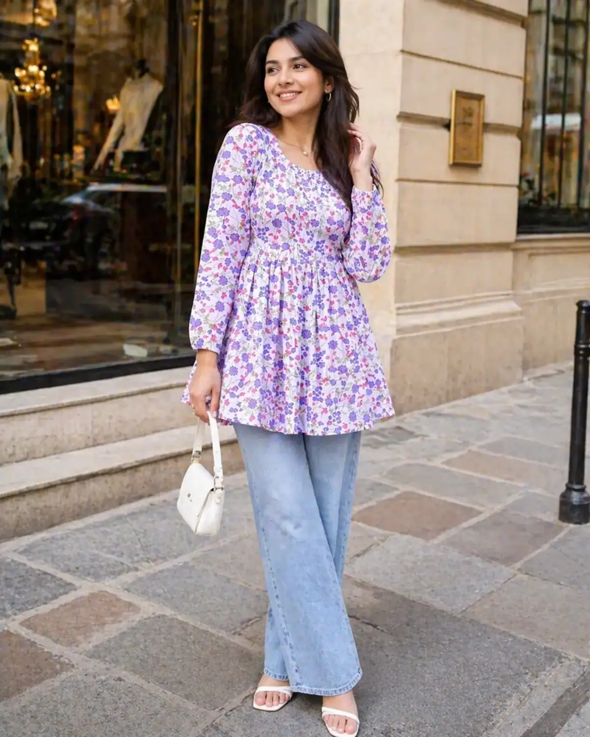 Beautiful all-over purple and pink floral pattern with a refreshing feminine touch. - Stylish Short Kurti Length