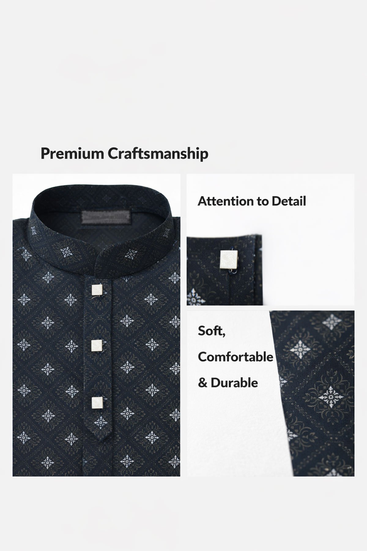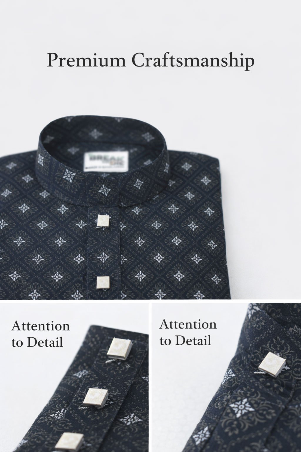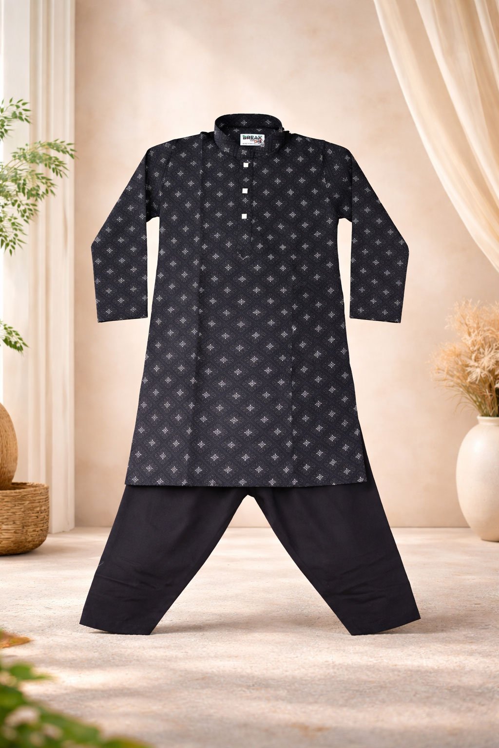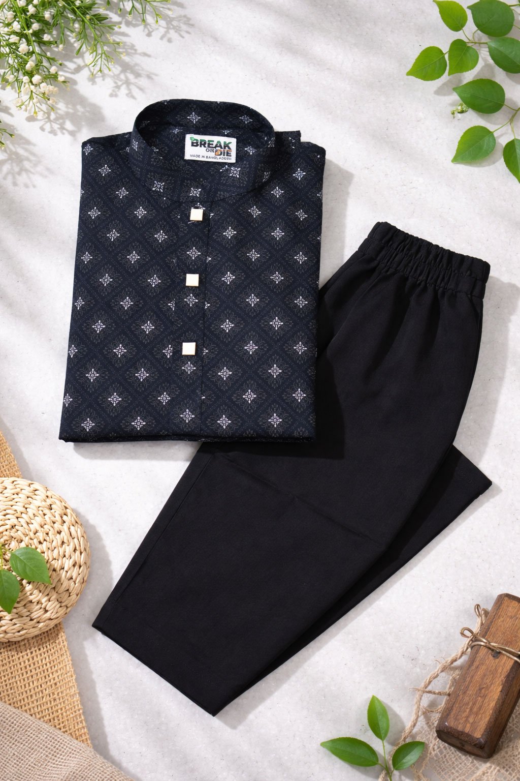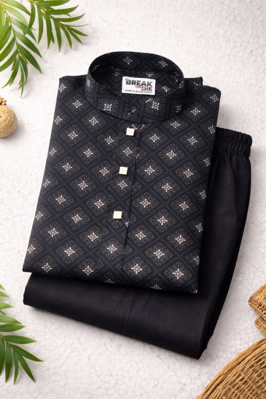 The Break or Die | Hand & Heart™ Kids Black Diamond Pattern Kurta Set with Black Pajama blends bold elegance with timeless tradition, offering growing kids a confident and graceful outfit for special occasions.