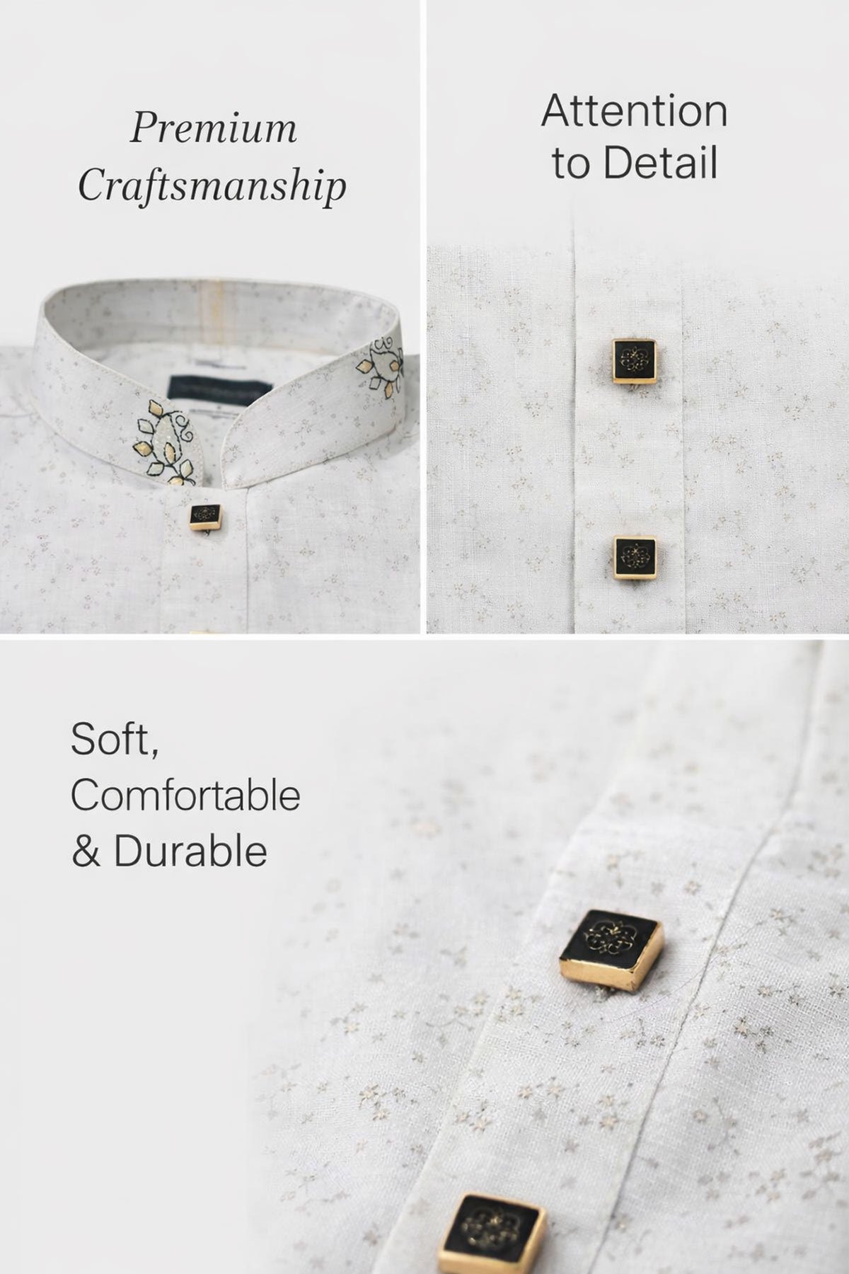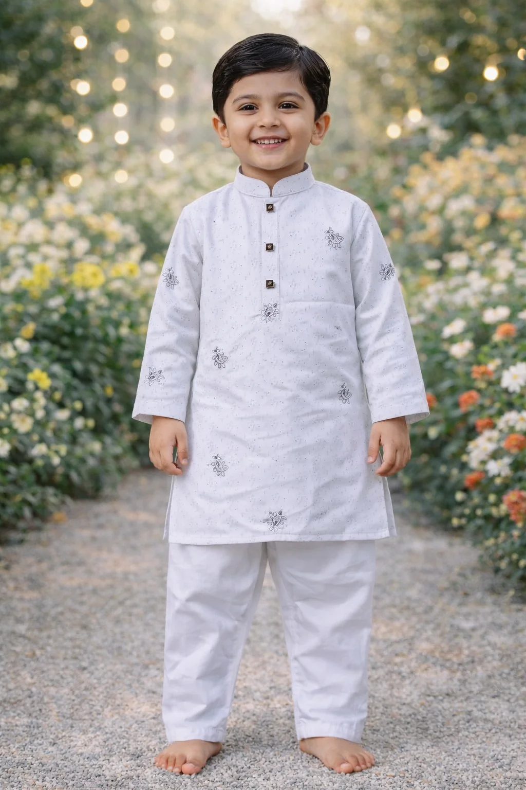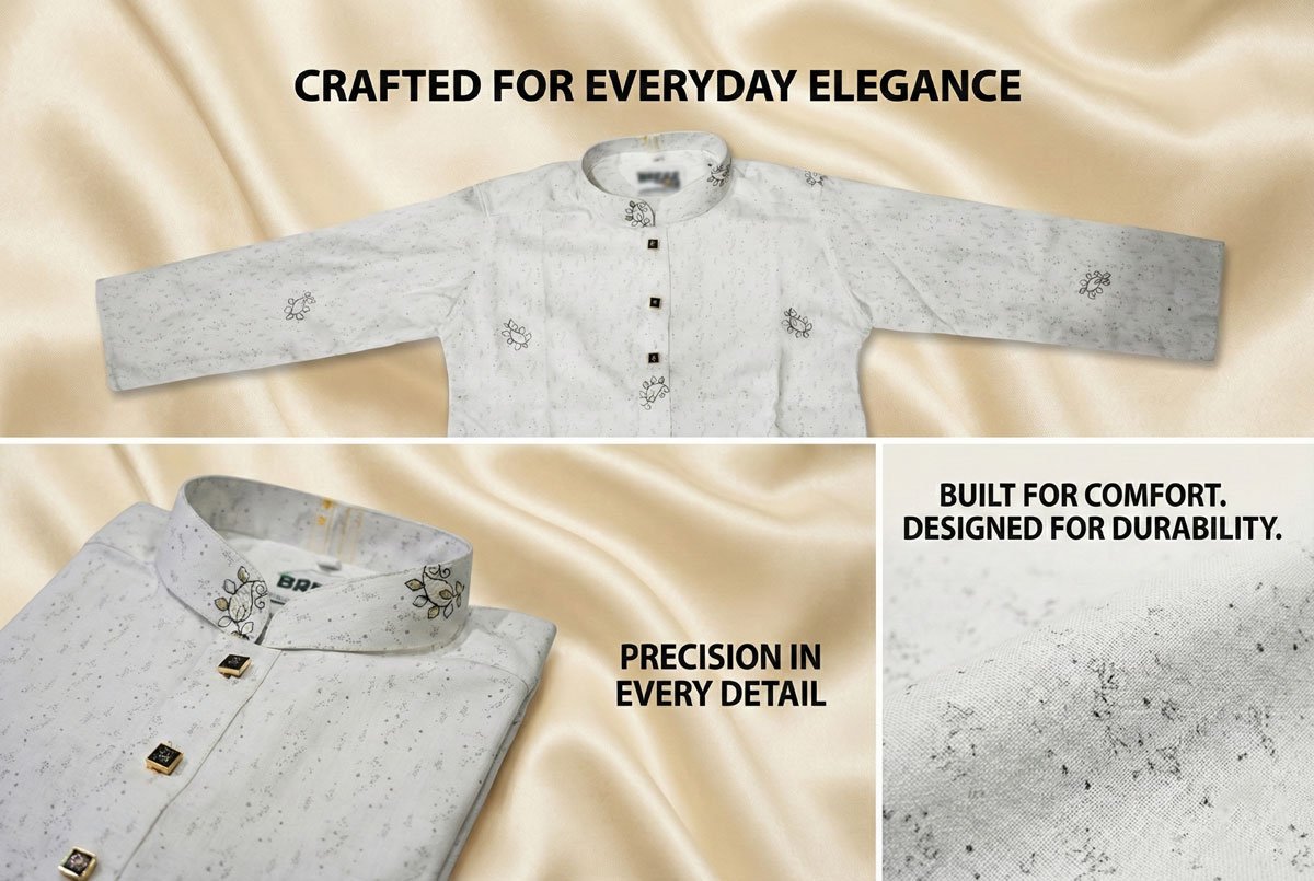 Made from 100% pure cotton, this set is soft, breathable, and gentle on delicate skin—ideal for all-day wear. The light grey kurta is adorned with subtle embroidered motifs that add a touch of sophistication, while maintaining a calm, refined aesthetic rooted in heritage style.
