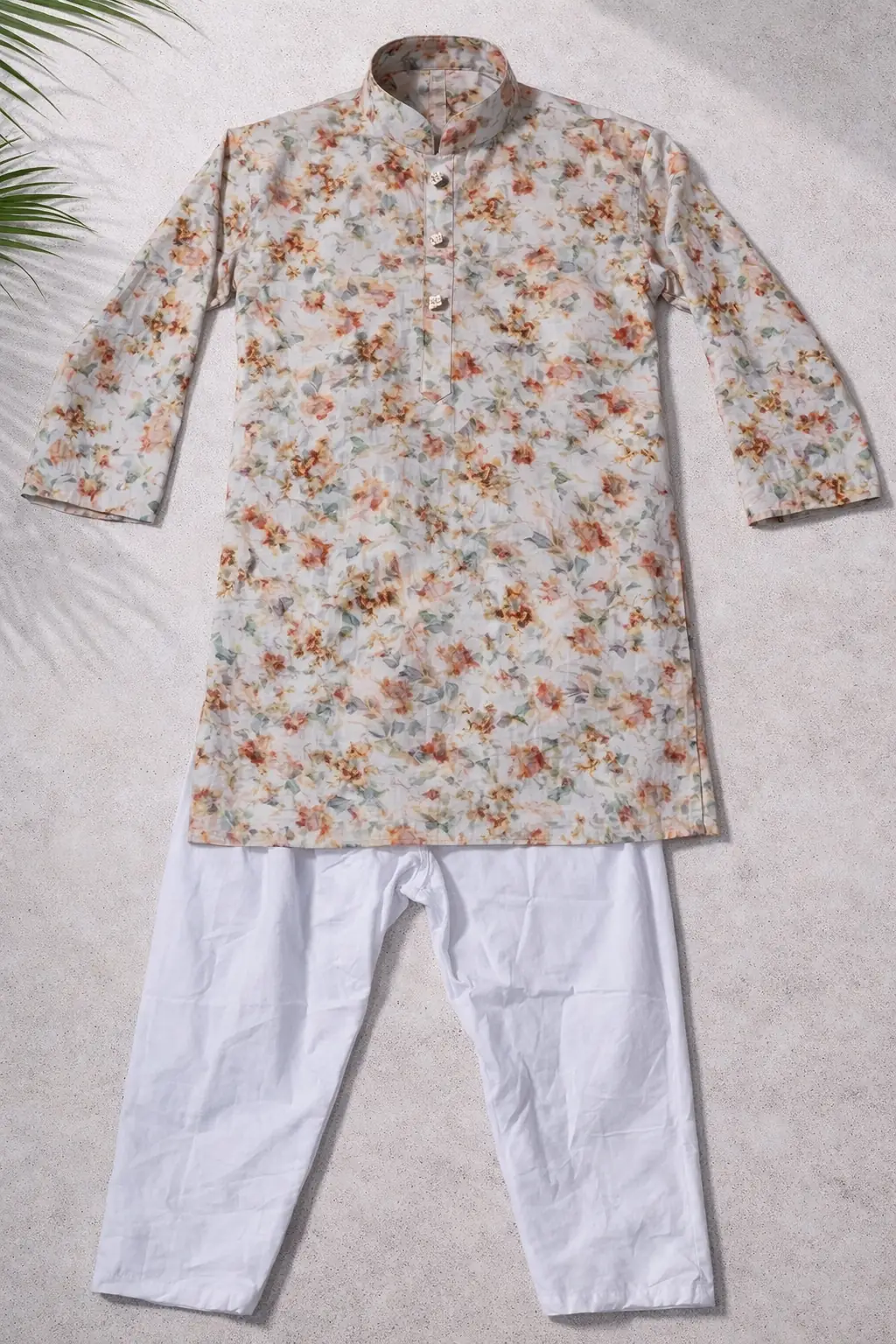 The Break or Die | Hand & Heart™ Kids Cream Floral Printed Panjabi Set with White Pajama blends gentle elegance with timeless tradition, creating a refined yet comfortable outfit for special moments in a child’s life.