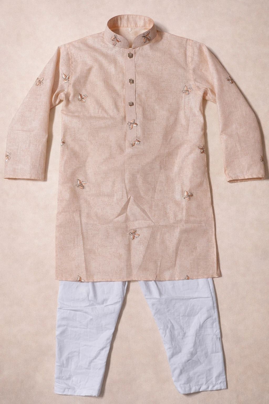 The Break Or Die | Hand & Heart™ Kids Peach Embroidered Kurta Set with White Pajama is a graceful blend of tradition, comfort, and thoughtful craftsmanship—created especially for young ones to celebrate culture with ease.