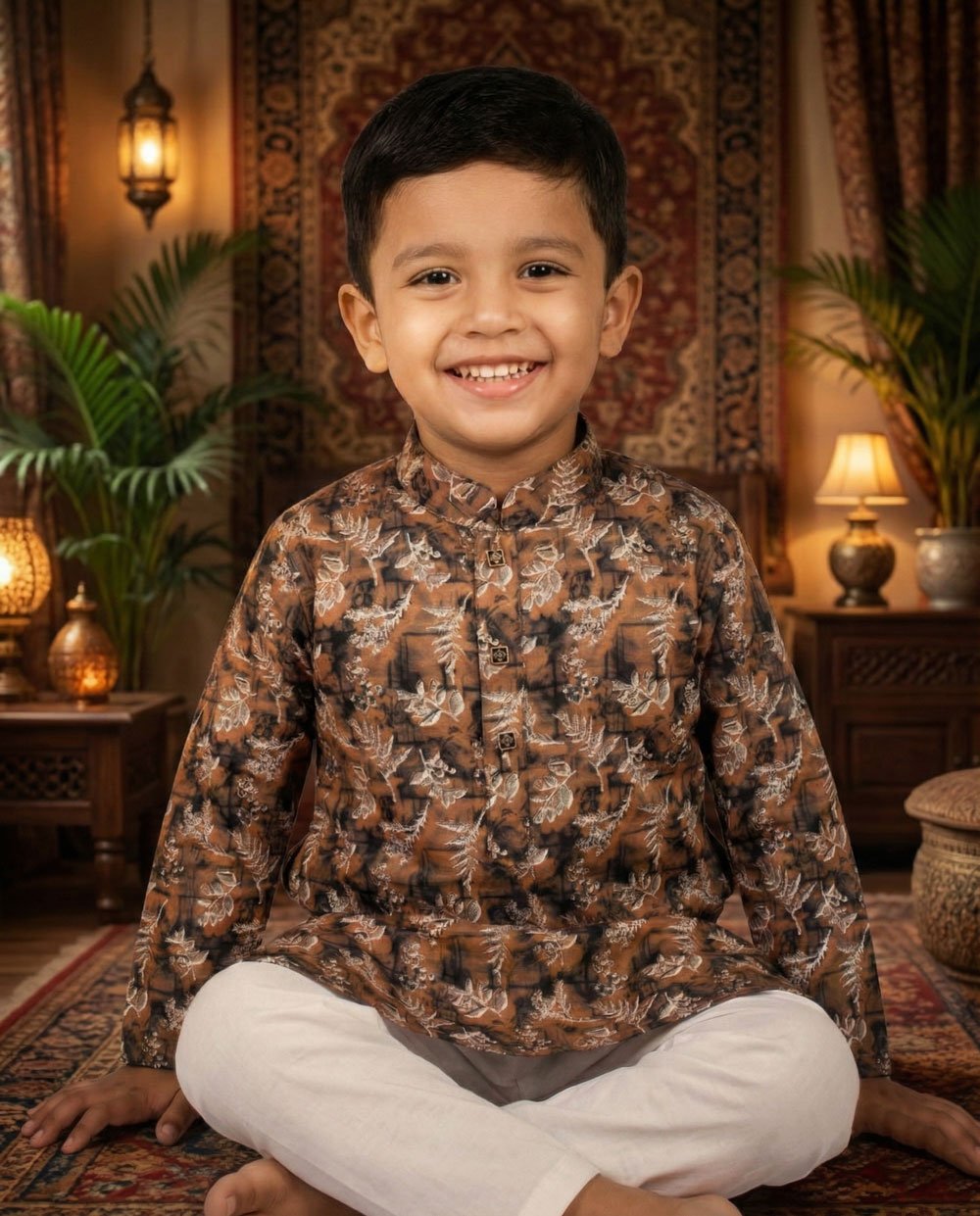 The rich brown kurta, adorned with an elegant floral print, brings a warm and refined aesthetic, while the classic white pajama balances the look with simplicity and grace. Designed with a traditional band collar and clean tailoring, this set embodies heritage craftsmanship in a child-friendly silhouette.