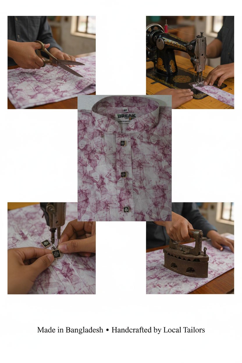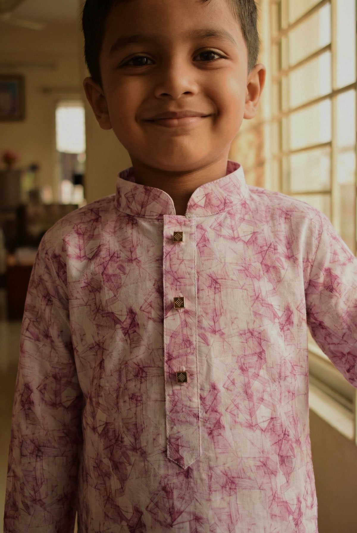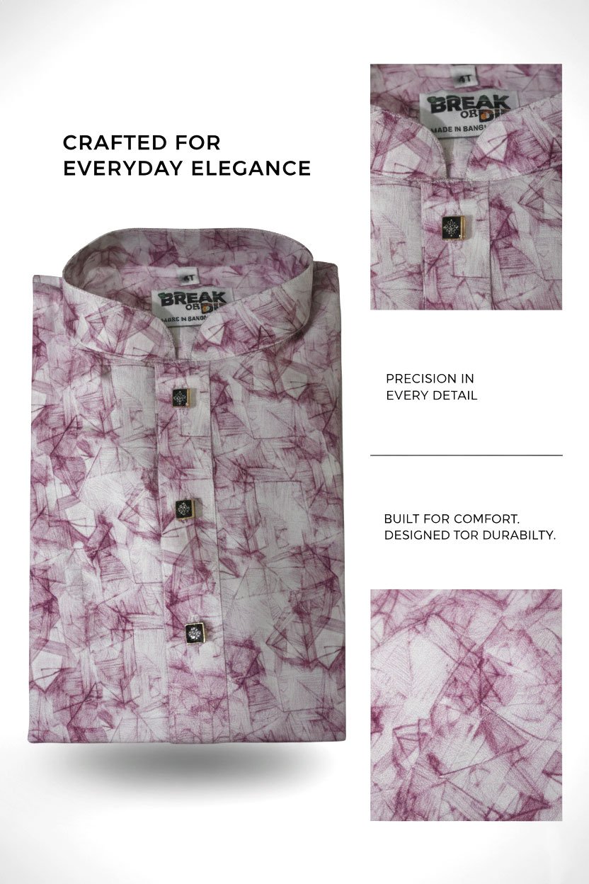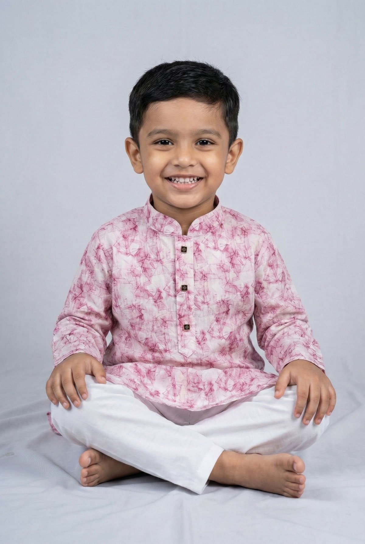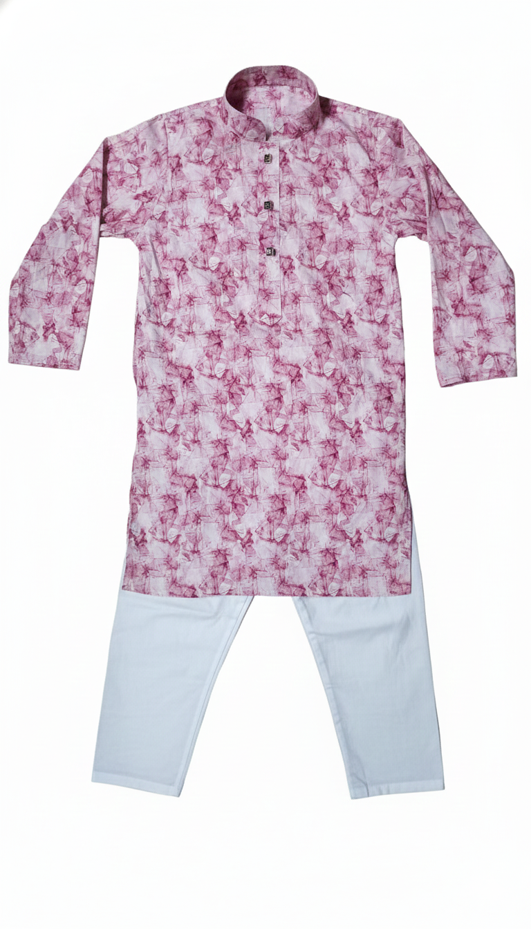 Made from 100% pure cotton, this set is soft, breathable, and gentle on delicate skin—perfect for all-day wear. The pink and white abstract print brings a fresh, joyful look, while the classic Panjabi silhouette keeps the design rooted in heritage style.