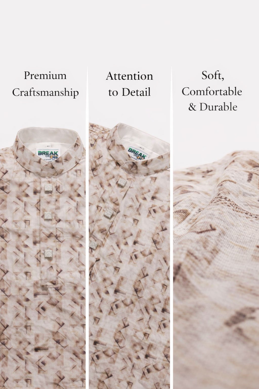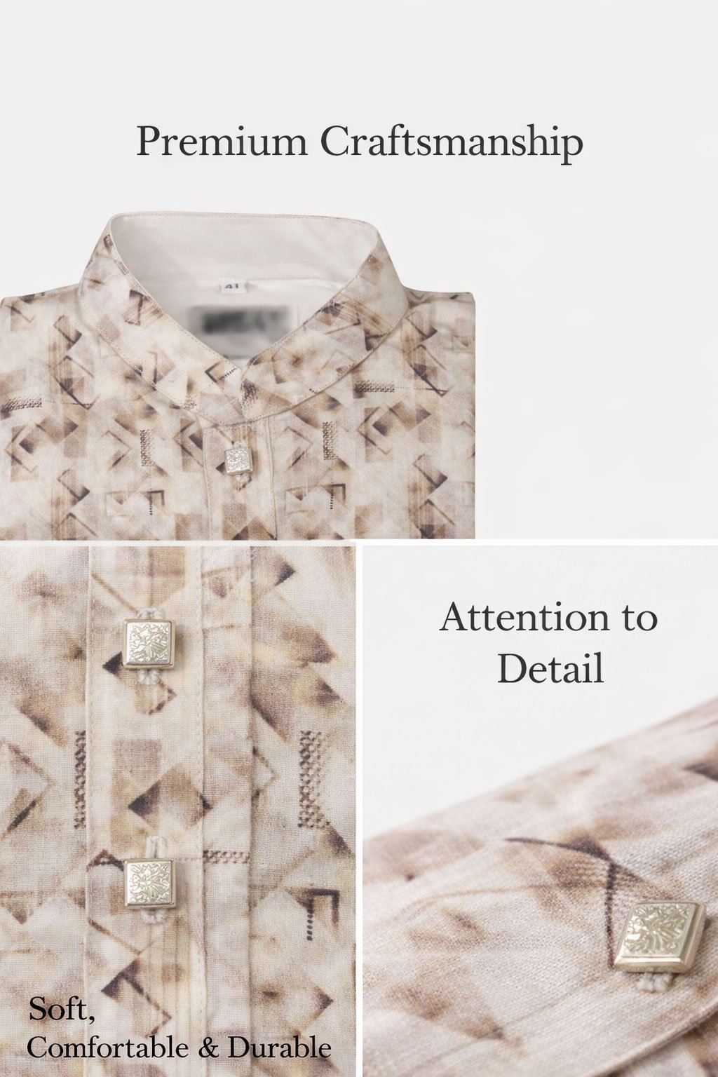 The Break Or Die | Hand & Heart™ – Kids Beige Abstract Printed Kurta Set with White Pajama is a beautiful expression of tradition, comfort, and thoughtful craftsmanship—designed especially for young boys.