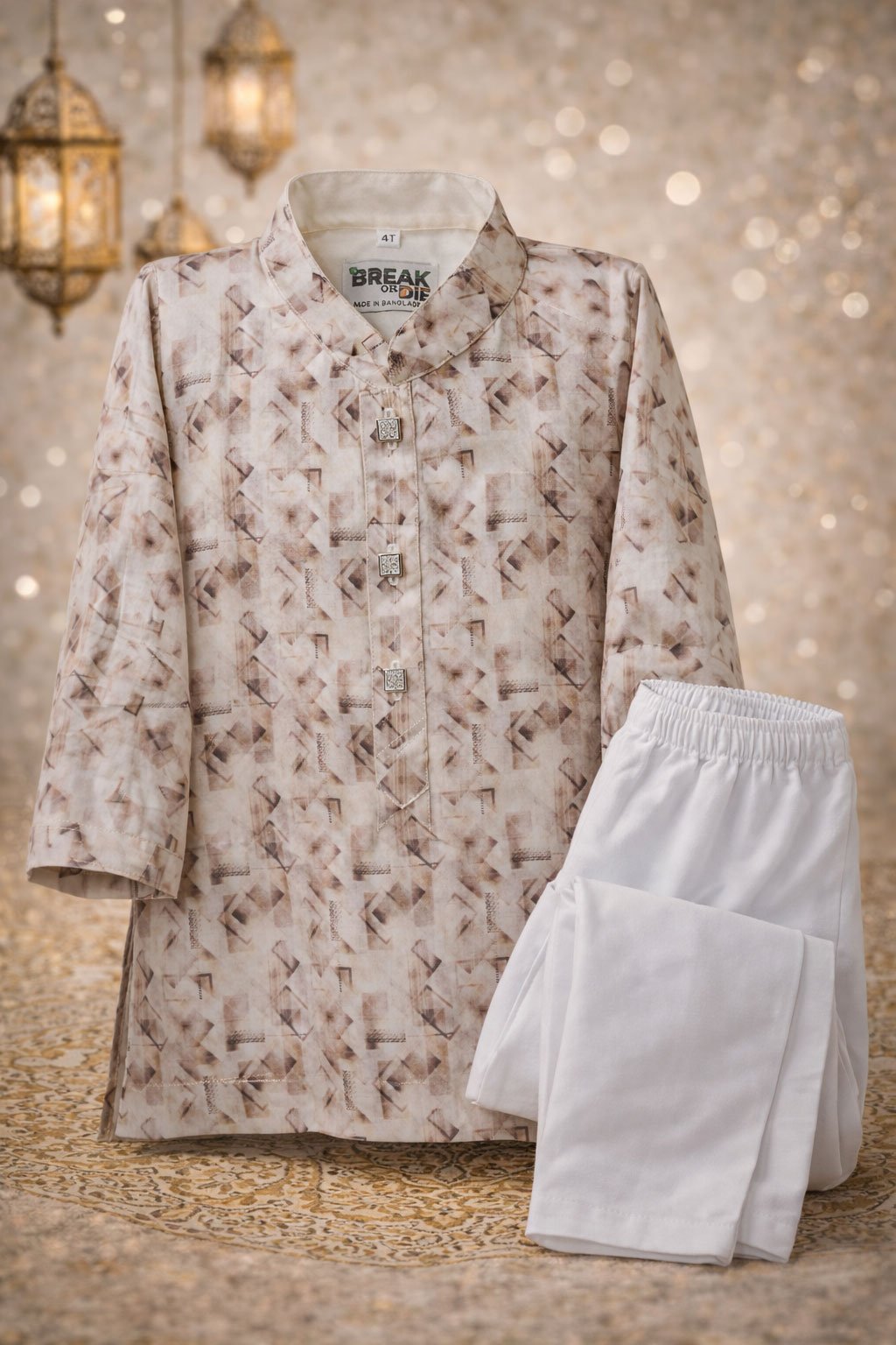 A graceful kids kurta set featuring a beige abstract-printed cotton kurta paired with classic white pajama. Made from 100% breathable cotton for all-day comfort, perfect for festive occasions, family gatherings, and cultural celebrations.