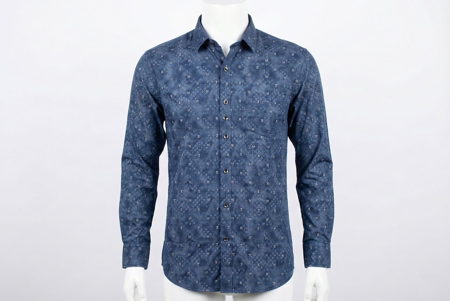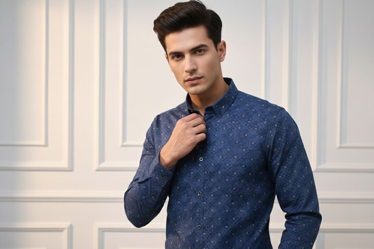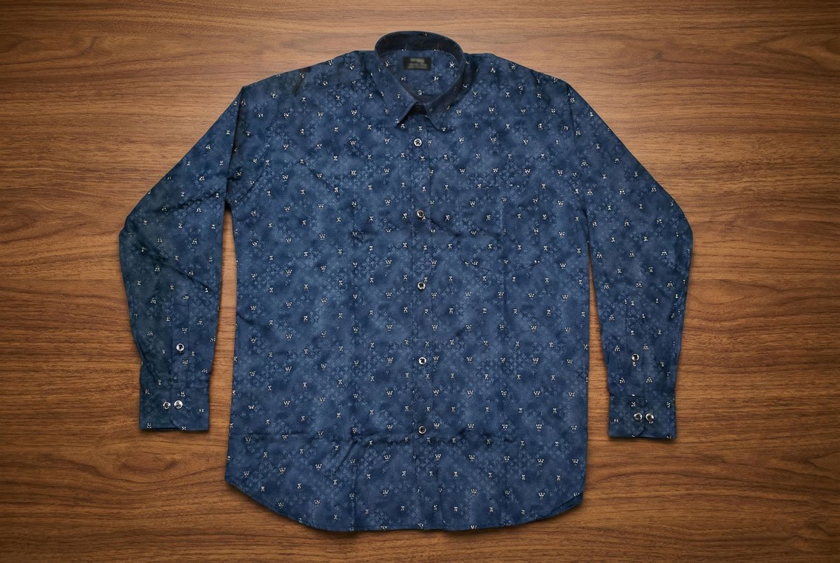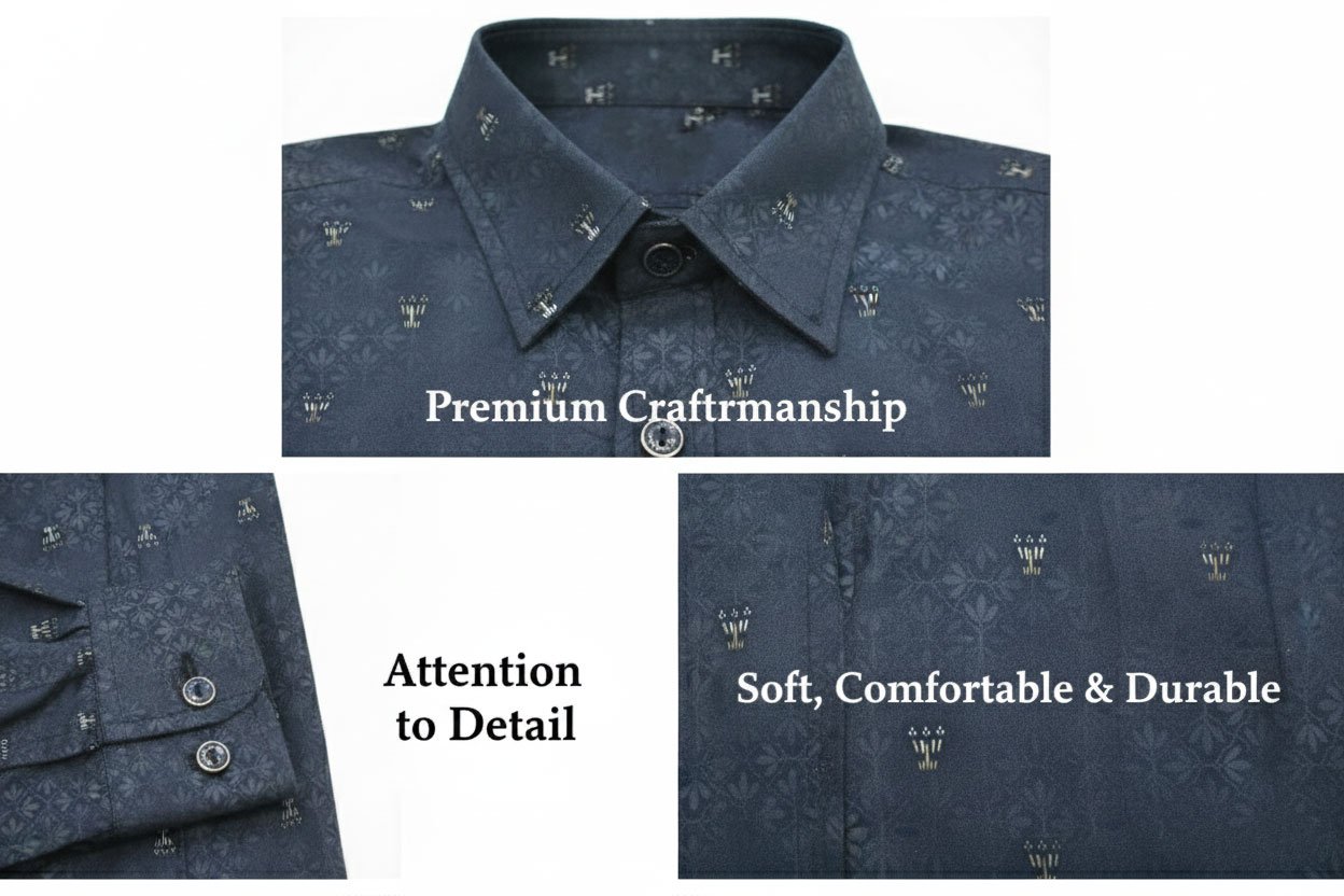 The deep navy tone paired with a subtle textured pattern delivers a refined yet versatile look—perfect for daily wear, cultural gatherings, or elevated casual occasions. Designed with a balanced fit and durable construction, this shirt reflects the tradition of slow, thoughtful tailoring passed down through generations.