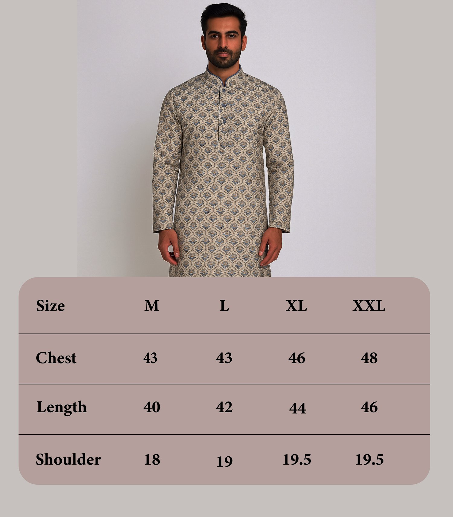 This premium men’s Panjabi is made from 100% cotton and distinguished by an all-over beige fabric enriched with refined blue heritage motifs. The subtle contrast creates a graceful, timeless aesthetic—rooted in tradition yet designed for modern wear.