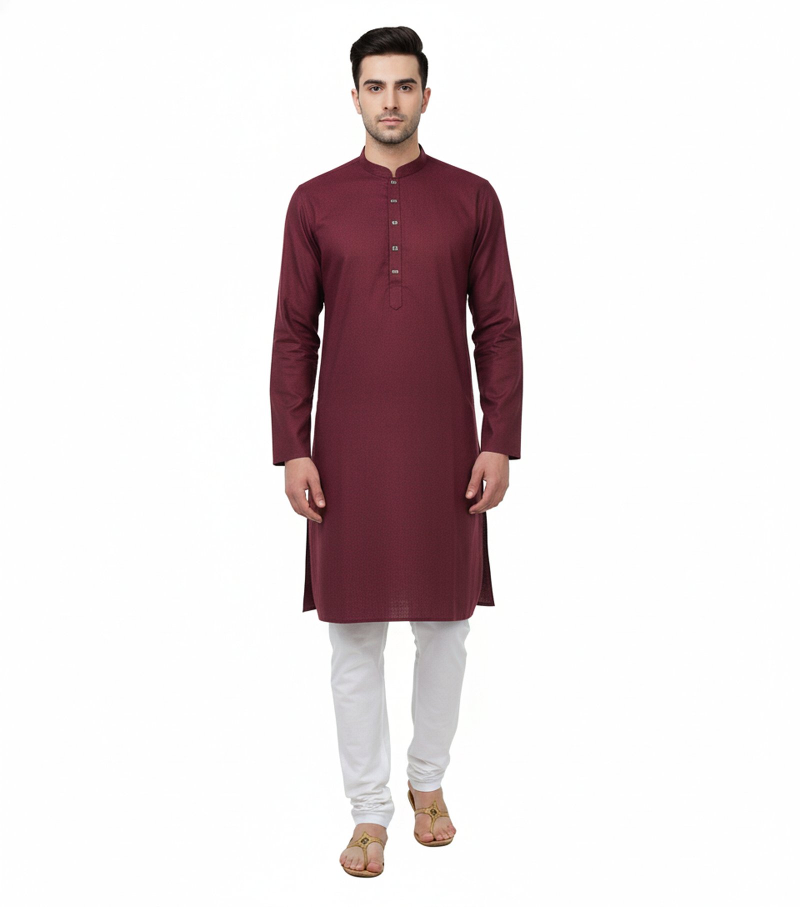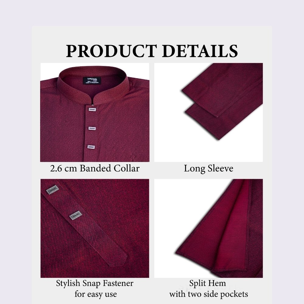 This premium men’s Panjabi is made from 100% cotton and presented in a deep maroon hue that reflects heritage, strength, and timeless sophistication. Its clean silhouette, refined collar, and subtle button detailing create a balanced design that speaks through restraint rather than excess.