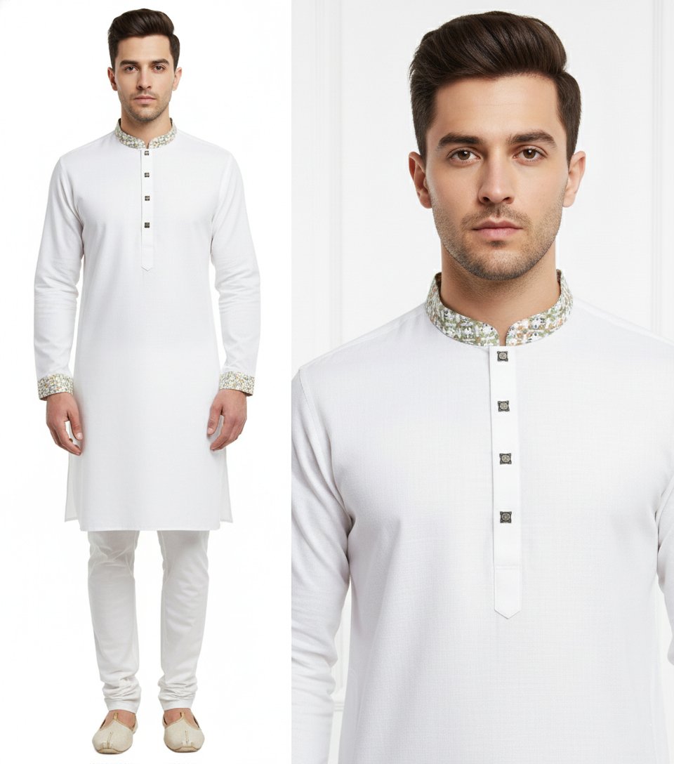 This premium men’s Panjabi is made from 100% cotton and presented in a clean ivory-white tone that reflects purity, balance, and timeless style. The understated heritage-patterned collar adds quiet character, offering a refined contrast without overpowering the design.