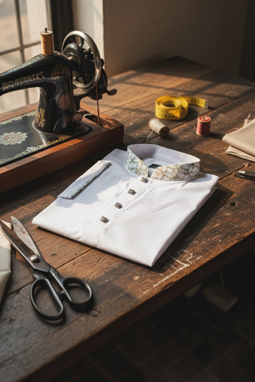 ✔️ Clean ivory-white fabric with a refined heritage-patterned collar
